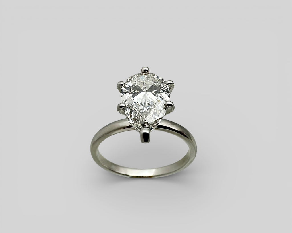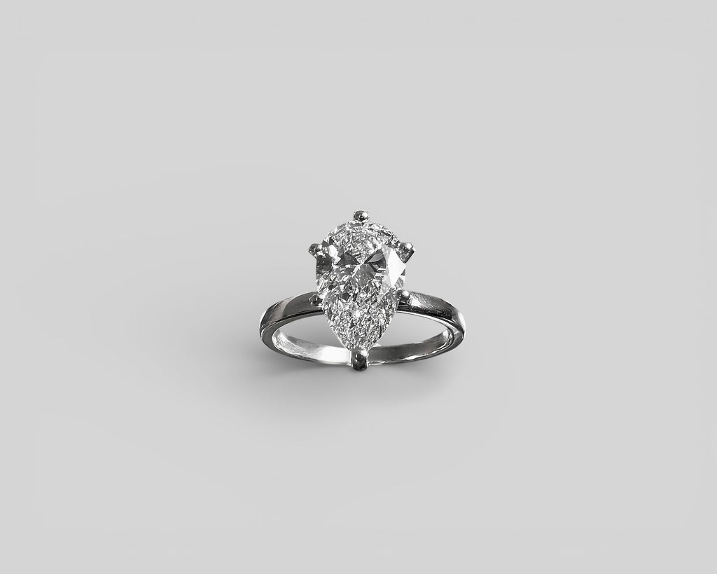At its center rests a two-carat pear-cut responsibly cultivated white diamond, selected for its exquisite luster and graceful silhouette. The elongated form brings a sense of movement and light, subtly echoing the beauty of natural asymmetry.