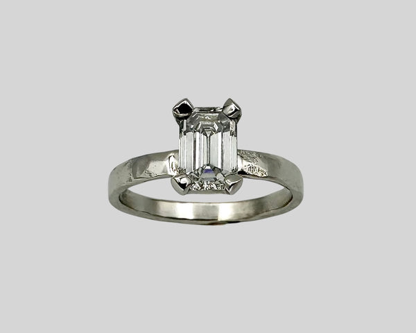 The composition is both classic and immediate — a timeless silhouette brought into the present through the intimacy of hand forging. The platinum’s organic texture contrasts gently with the precision of the cut stone, creating a harmony between nature, craft, and light.