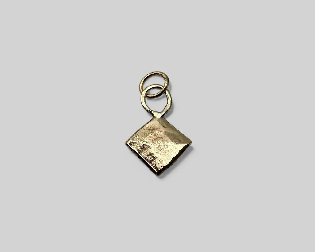 Hand-forged in 14 kt yellow gold, this quadrate form is suspended from its apex, creating a subtle diagonal fall. Shaped and polished entirely by hand, its surfaces carry a soft organic luster—an irregular refinement that feels as if it could have been found in the river.