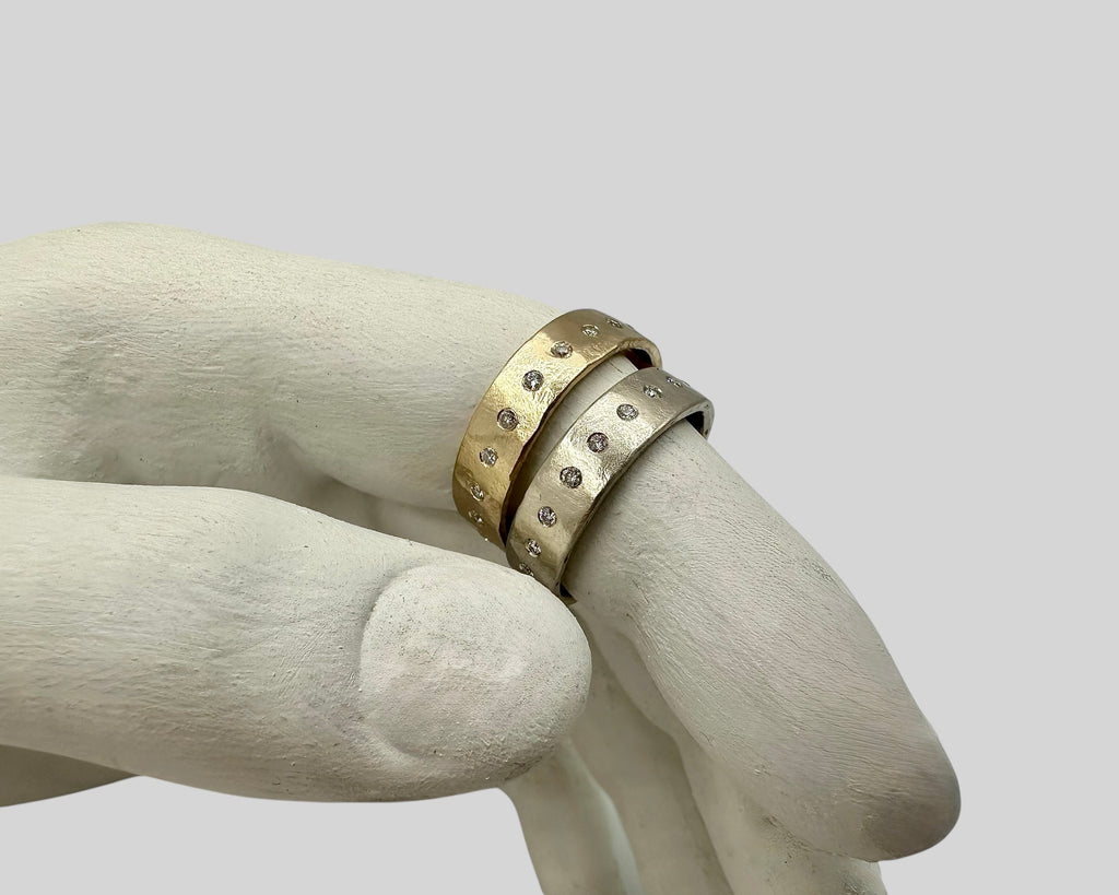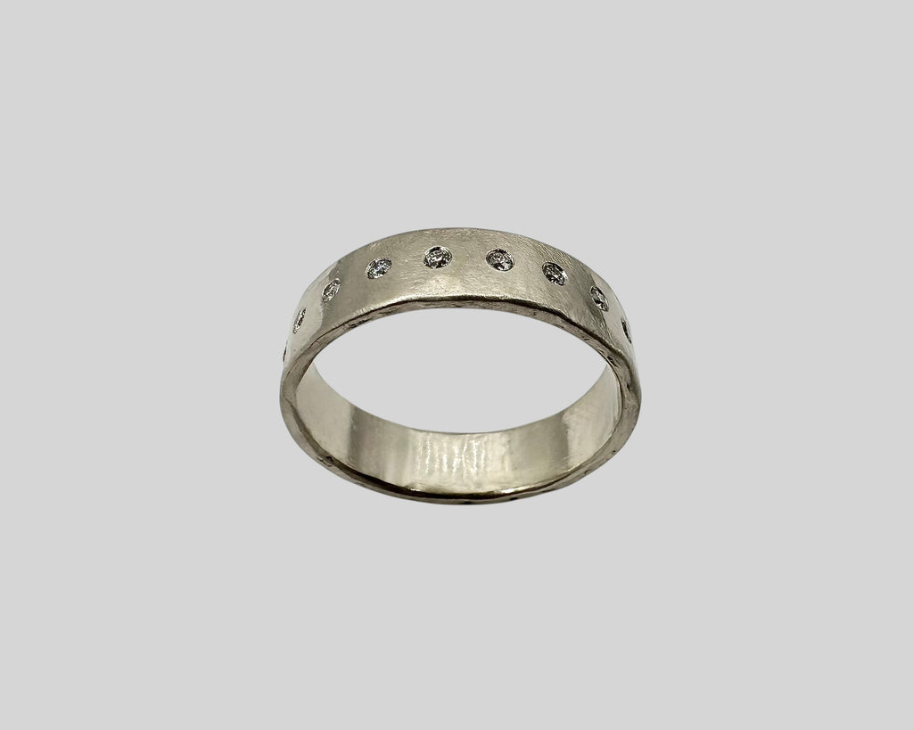 Minimal yet chic, David’s 5mm wide 14KT white gold ring is hand-forged with a distinctive, artisanal texture left by the maker’s hand. Twenty 0.01-carat white diamonds are set along the center in a subtly irregular yet harmonious pattern, symbolizing a connection between past and future. This monochromatic white-on-white design is meticulously crafted, allowing light to move beautifully across the band. A true testament to expert craftsmanship, this piece embodies understated elegance and timeless sophistication.