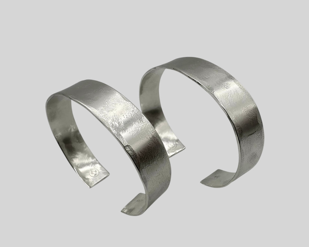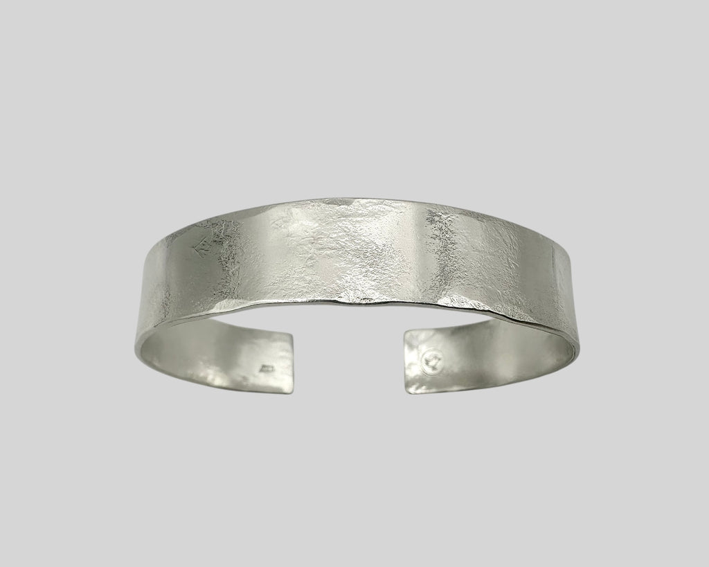 Each cuff is individually hand-forged and hand-finished, resulting in a richly textured surface that catches the light with subtle, organic depth. No two are exactly alike. The texture is not applied — it is born from the forging process itself, a testament to the integrity of true metalsmithing.
