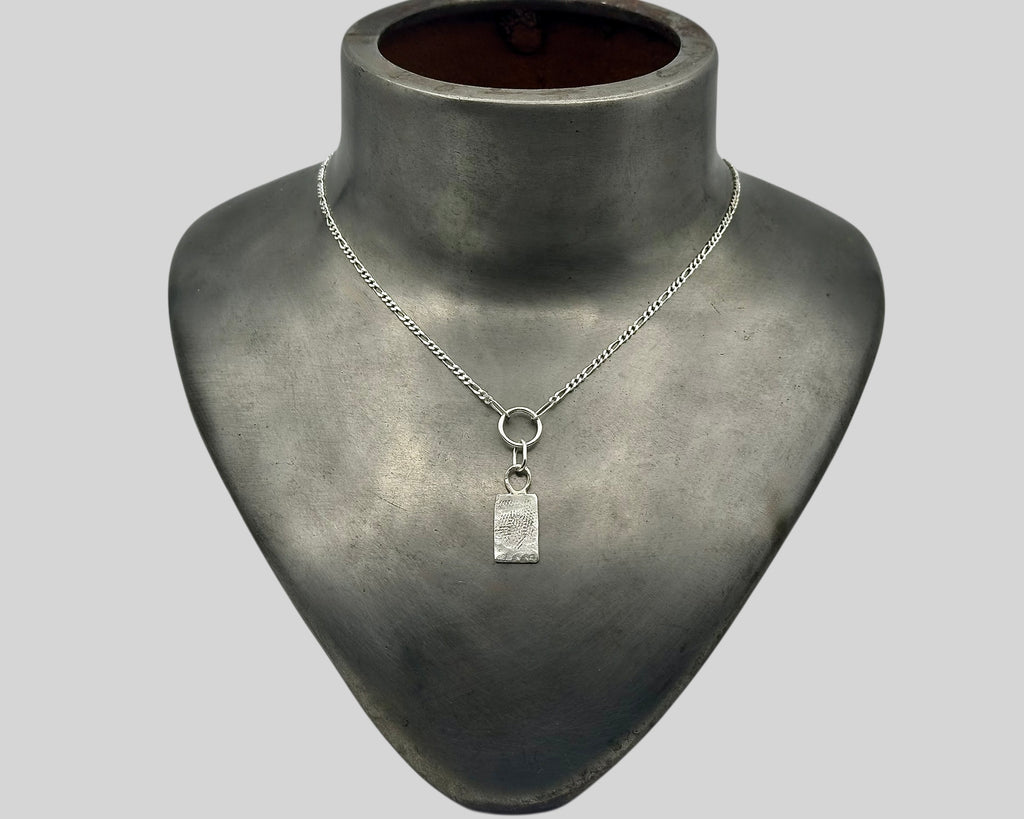 A forged sterling silver tag necklace with a free-form rectangular shape. Shaped by hand through forging, the edges remain alive and irregular, carrying the marks of process and intention. A richly textured surface adds depth and dimension, catching light softly rather than shining.