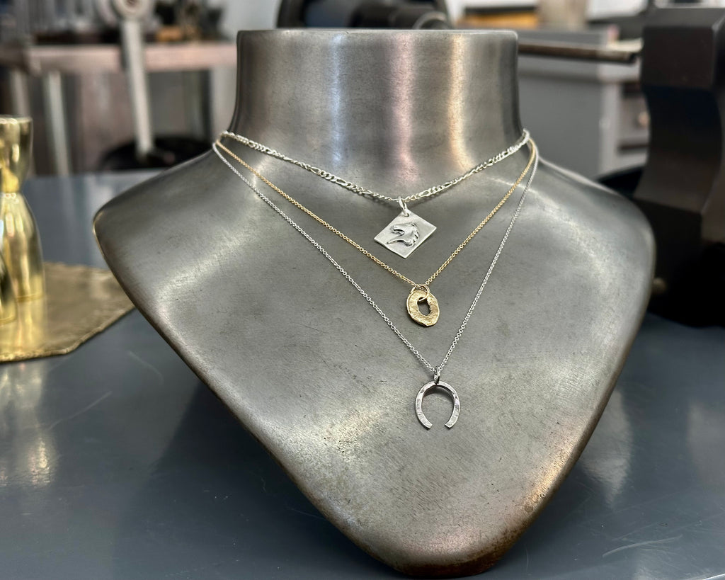 Delicately hand-forged and hand-crafted in 14 karat white gold, the Equus Fortune Shoe pendant captures the elegant curve of a U-shaped horseshoe in miniature perfection. Measuring approximately 10 × 10 mm, its lustrous, hand-polished surface reflects meticulous attention to detail and quiet sophistication. Suspended from an intricate, slender 14 kt white gold chain and secured with the signature Jelena Behrend clasp, this 18-inch pendant embodies timeless luxury and artisanal mastery. A symbol of protection, fortune, and refined taste, it is designed to be worn alone or layered with other cherished pieces for a personal statement of elegance.