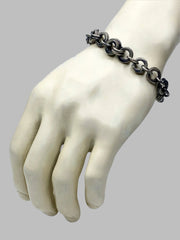 The Triple Double Moon Link Bracelet is a handcrafted masterpiece, featuring a design that combines triple and double-layered signature Jelena Behrend Moon links. Each link is meticulously made by hand, creating a beautiful and harmonious flow. The bracelet is finished with a handmade clasp and treated to achieve an 'aged' look, evoking ancient artistry and timeless design. This special bracelet is available in women's size, offering a truly unique and elegant piece that celebrates both heritage and modern craftsmanship.