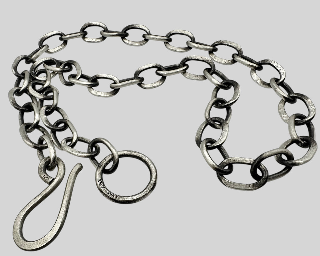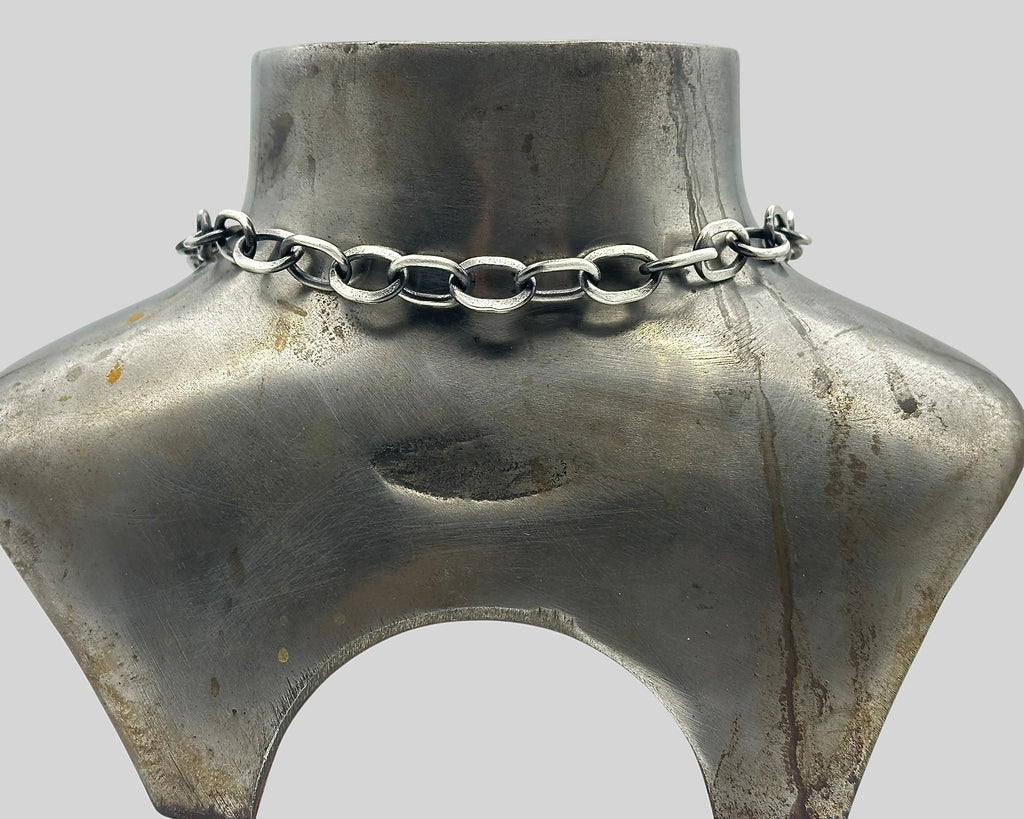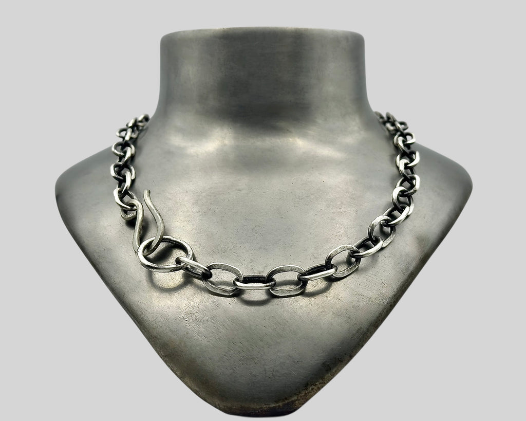 A substantial hand-forged chain of rare presence and quiet power. Each link is individually formed, textured, and hand-finished, creating a surface that feels both ancient and alive—like you found it in the river. The sterling silver is intentionally darkened to an antique patina, allowing the sculptural texture to emerge with depth and nuance over time.